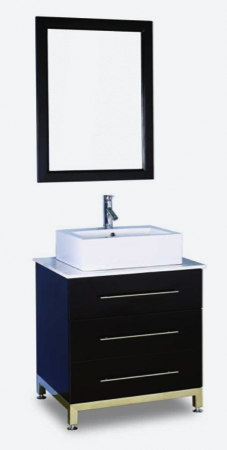 Description: A modern style vanity with framed mirror, marble counter top, ceramic basin, stainless steel legs and wood cabinets. A sleek design to fit any modern bathroom style.