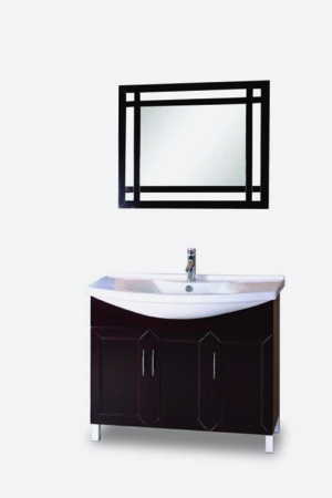 Description: A modern style vanity with framed mirror, mirror shelf, ceramic counter top, ceramic basin/bedplate and wood cabinets. A sleek design to fit any modern bathroom style.