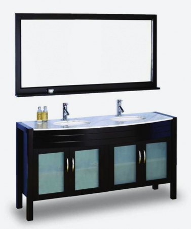 Description: A modern style double vanity with framed mirror, marble vanity counter top, ceramic sink and wood cabinets. A sleek design to fit any modern bathroom style.